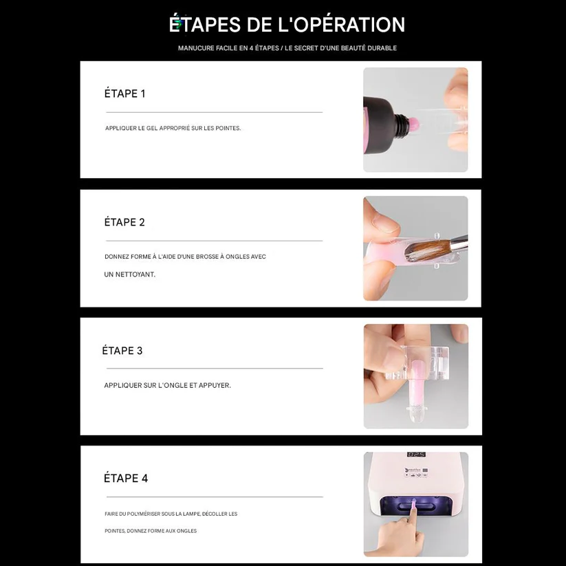– Appliquer sur ongle naturel (après une base souple), sur capsules, avec popits ou chablons                                                          – Catalysation 60s                                                                                                                                                                                 – Usage professionnel ou particulier